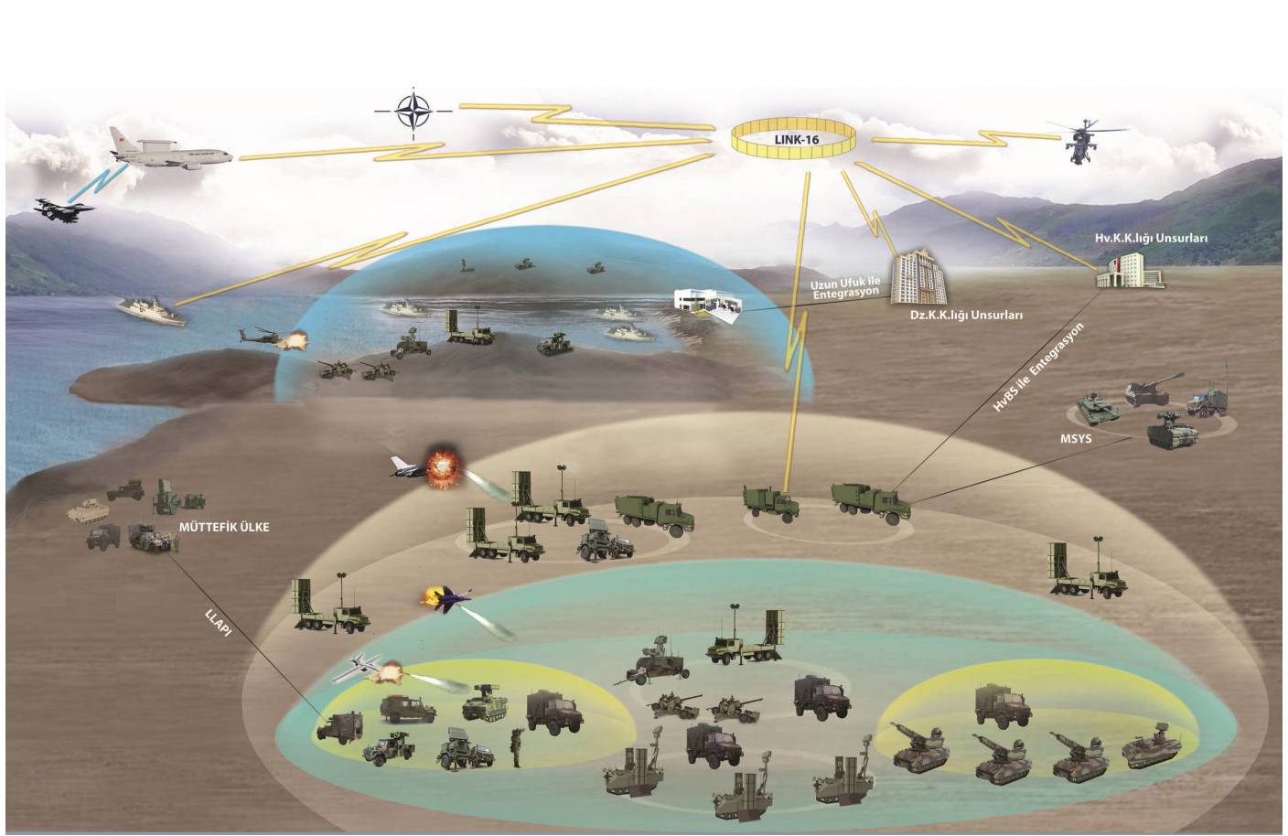 Entegre Hava Savunma Komuta Kontrol Sistemi; kısa, orta ve uzun menzilli tehditlere karşı savunma için geniş kapsamlı sensör ve komuta kontrol unsurları ile;