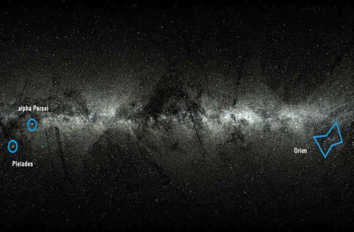 Aşağıdaki videoyu izlediğinizde, yukarıdaki resimde işaretlenen Orion takım yıldızının, Pleiades’in ve Alpha Persei’nin hareketlerini de görmeye çalışın. Zaman etiketini kontrol etmeyi de unutmayın: her bir çerçeve, 750 yıla eşdeğer olmakla birlikte videonun tamamı yıldız hareketlerinin 5 milyon yıla tekabül eden bölümünü gösteriyor. Dikkat ederseniz ön taraftaki yıldızlar arkadakilerden daha hızlı hareket ediyorlar. Bunun sebebi gezegenimize daha yakın olmaları.