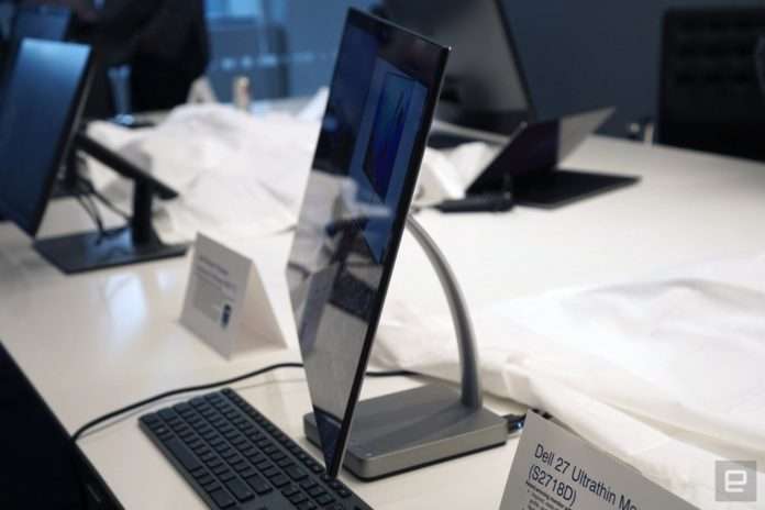 Dell 27 inç’lik ultra-ince monitörü ile CES fuarında dikkatleri üzerine çekmeyi ümit ediyor. Ekran, hayatımda gördüğüm en ince monitör profillerinden biri. Donanımsal araçları ekranın gerisinde taşımayan monitör, dahili bütün donanımsal cihazları ekranın alt bölümünde barındırmakta. Dolayısı ile monitör ilk bakışta yekpare bir bilgisayar görünümü arz ediyor.
