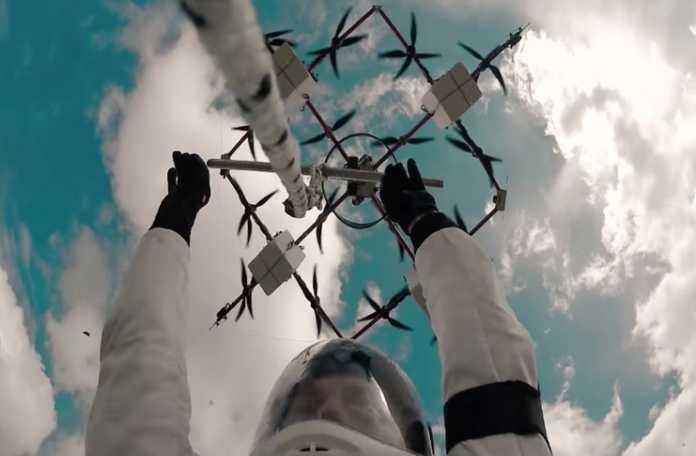 Aerones’in 28-rotor İHA’sı, skydiver Ingus Augustalns’ı paraşütünü açarak aşağıya atlayacağı yükseklik olan 330 metre yüksekliğe tırmanmadan önce bir kuleden aldı ve bu yüksekliğe kadar çıkardı.