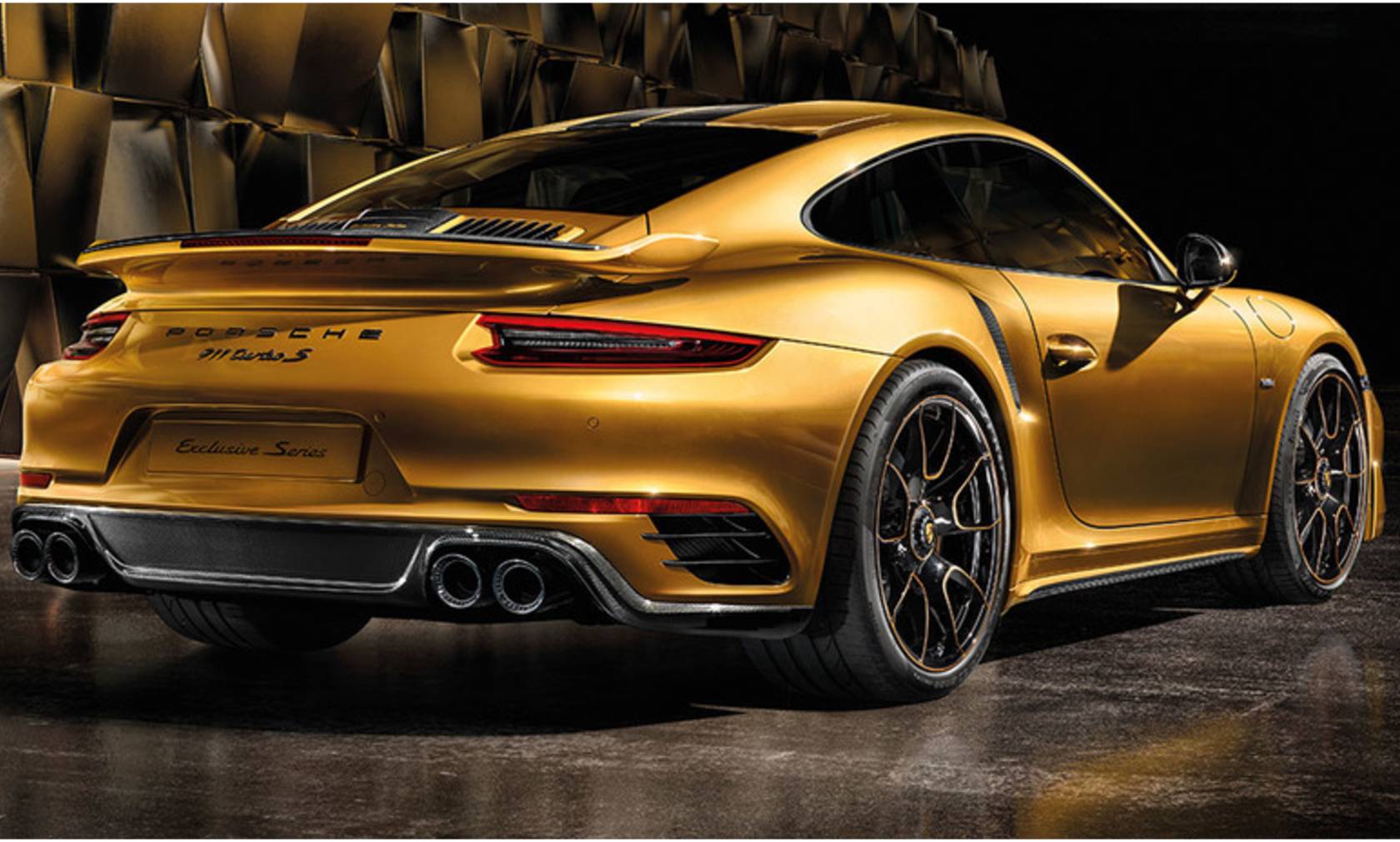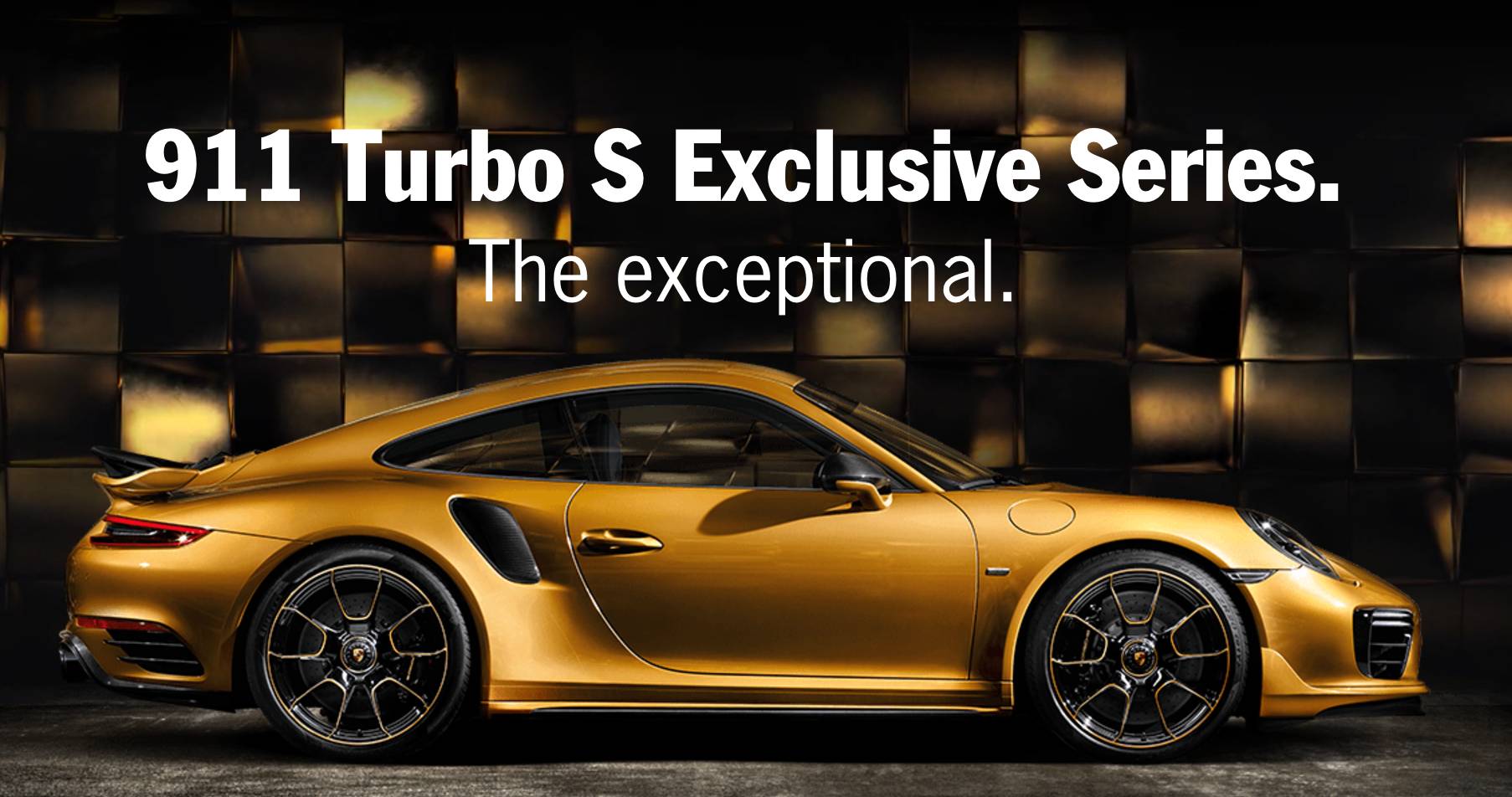Porsche için çok özel bir yer olan, Exclusive Manufaktur atölyesinde, meslek uzmanları el işciliği ve müşterilerin ilhamını, Porsche 911 Turbo S Exclusive aktardılar. Serinin en güçlü modeli. Altın sarısı metalik rengi ve kaputtan tavana uzanan karbon alaşımlı şerit özelliği ilk bakışta göze çarpan özelliklerinden. Aerokit arka kanat ve siyah renkli paslanmaz çelikten iki çift egzoz, ayrıca Exclusive Manufaktur plakalarını taşıyan dekoratif kanatlar ile eşsiz bir spor tasarımı ile Porsche desing hatlarını bir araya getirmişler.
