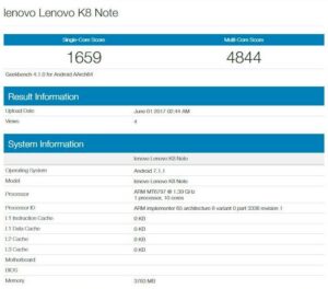 Lenovo tarafından önümüzdeki yıl piyasaya çıkarılması beklenen akıllı telefon K8 Note, Geekbench testlerinde karşımıza çıktı. Akıllı telefon, 10 çekirdekli olan Helio X20 işlemcisinden gücünü alacak. Ayrıca, cihaz, ARM Mali-T880 MP4 grafik biriminden de güç alacak. Cihaz, Android 7.1.1 Nougat işlemcisi yüklü olarak kutusundan çıkacak ve kullanıcılarına sunulacak. K8 Note, 4 GB RAM ile desteklenecek.