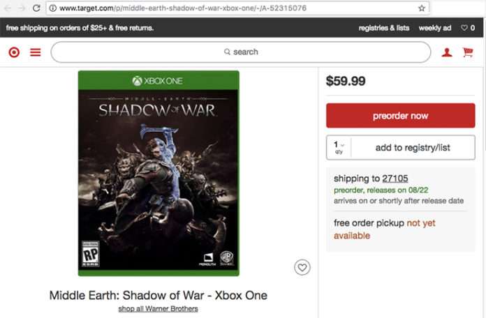 Online alışveriş sitesi Target’da beliren oyun Middle-earth: Shadow of War oyun dünyasında ciddi spekülasyonlara sebep oldu. Bunun sebebi ise oyuncular tarafından çok olumlu karşılanan Middle-earth: Shadow of Mordor’un devamı mı geliyor sorunu doğurması. Sitede gözüken oyun sadece ön siparişe açılmasıyla birlikte çıkış tarihi de 22 Ağustos 2017 olarak işaretlenmiş. Bu da teknik bir hata sonucunda oyunun sızdığını gösterir nitelikte.