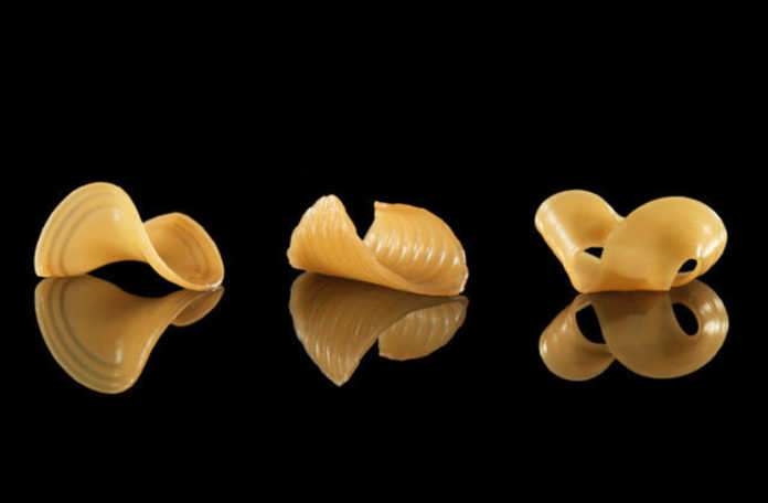 Massachusetts Institute of Technology’nin ‘Tangible Media Group’ adlı biriminin yaptığı yeni bir araştırma projesinde 3 boyutlu baskılama, moleküler gastronomi ve makarna bir araya geliyor. MIT News’ın haberine göre Wen Wang ve Lining Yao adlı mühendisler düz jelatin tabakalarla kolayı, suyla teması halinde tepkime vererek bükülen şerit makarnalara dönüştürdüler. Yao’nun kendiliğinden bükülebilen mantı yapma hayali şimdilik gerçekleşmesi zor olsa da, araştırma ekibi icatlarının yiyecek kargolama masraflarını düşürebileceğini ve catering sektöründe yeni trendleri beraberinde getirebileceğini düşünüyor.