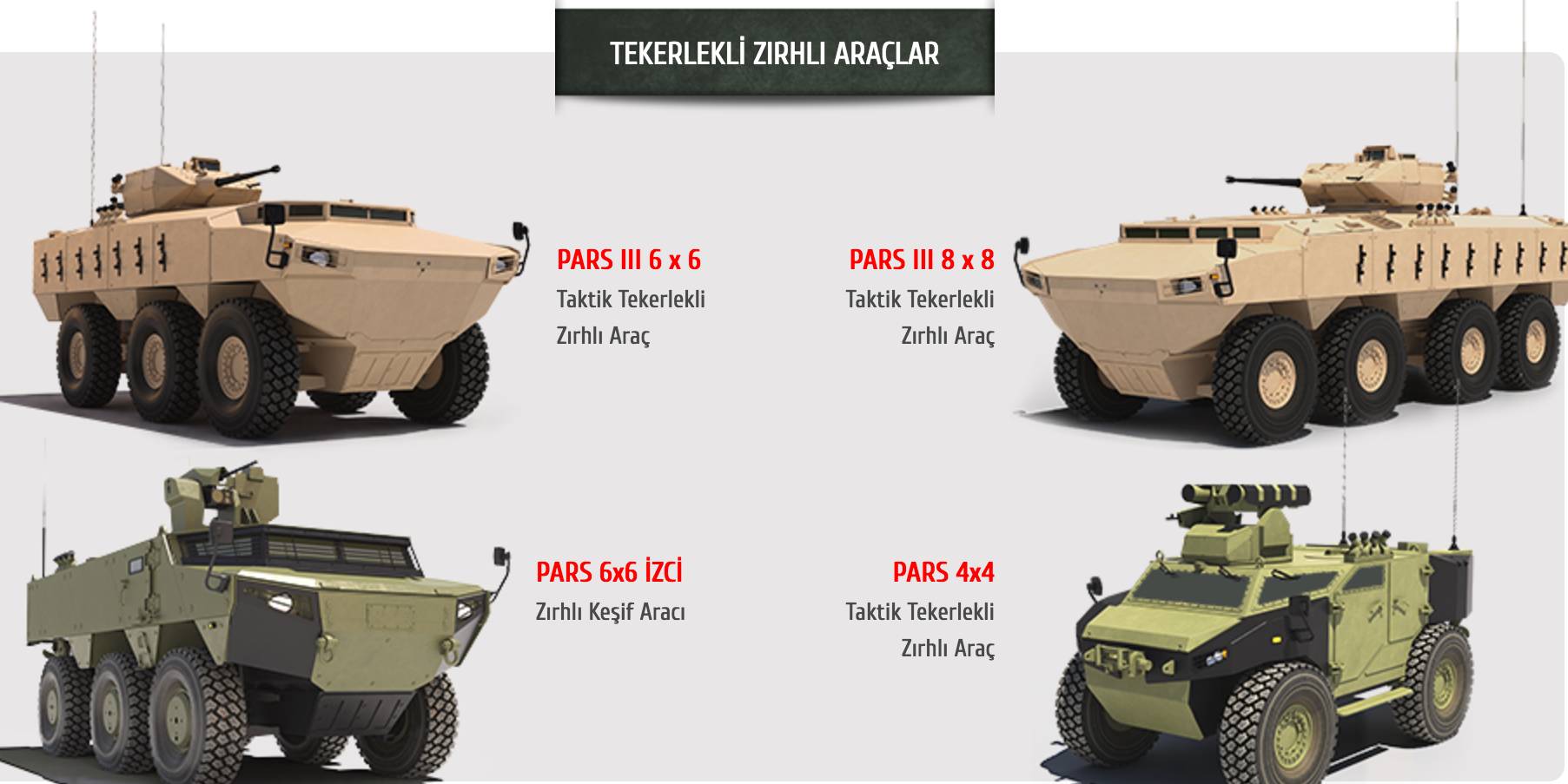 FNSS savunma sistemleri A.Ş tarafından üretilen,düşük ve yüksek yoğunluklu muharebe alanlarında kullanılmak üzere tasarlanmış, benzersiz özellikleri ile kullanıcısına stratejik avantajlar sunan, yapısında günümüzün en gelişmiş teknolojilerini barındıran, taktik tekerlekli zırhlı muharebe araçlarıdır.30.000 kg azami yüklü ağırlığa sahip olan PARS III 8X8, dizel motorla donatılmıştır. 100 km/s hıza ulaşabilen araç %60 dik, %30+ yan eğimde hareket edebilmekte, 70 cm yüksekliğinde dik engel ve 200 cm uzunluğunda hendek geçebilmektedir.