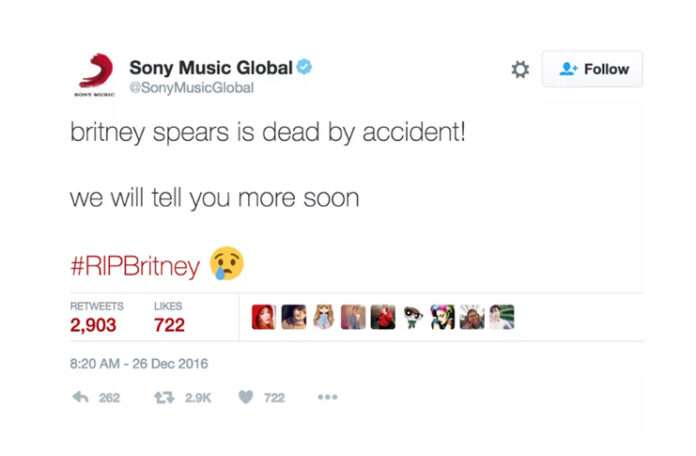 Sony Music ile ilgili bazı Twitter hesapları görünüşe göre geçtiğimiz sabah hacker grubu OurMine tarafından hacklendi. Sony Music Global ve Bob Dylan hesaplarından, Britney Spears’ın öldüğü söylendi: “Britney Spears geçirdiği trafik kazasında hayatını kaybetti! Az sonra detayları vereceğiz. ” @SonyMusicGlobal hesabı tweetler silinmeden önce okundu. Spears’ın menajeri ise CNN’e şarkıcının aslında hala hayatta olduğunu doğruladı.