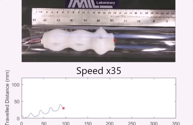Rentschler’in robotundaki peristalsis ‘biçim-hafıza’ alaşımı (şeklini hatırlayan ve ısıtıldığında o şekle dönen bir materyal cinsi) kullanılarak yapılmış yaylarla simüle ediliyor. Metal küçük bir elektrik akımı ile ısıtılır ve dışa doğru genişler. Daha sonra bir fan ve robotun dışını kaplayan 3 boyutlu basılmış silikon kılıf, eski şekillerine dönmeleri için zorlayıcı doğal faktör olarak hareket eder. Rentschler “Bununla yol boyunca ilerleyebilir ve yönetimini sağlayabiliriz” diyor. “Sonra da sadece ucuna bir kamera yerleştireceğiz.”