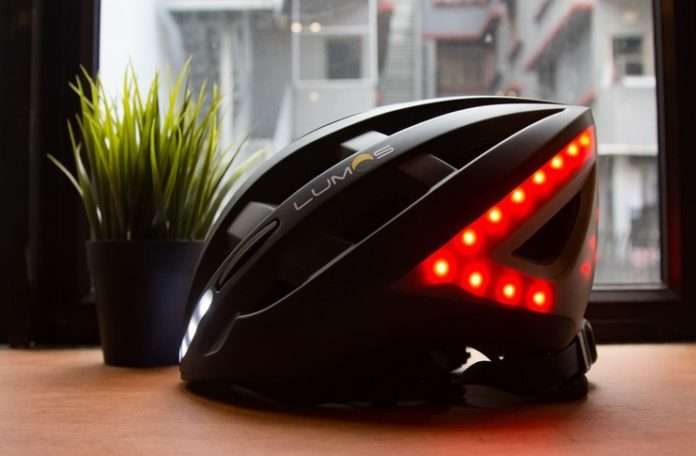 ‘Lumos’ kaskı, tıpkı motorize araçlarda görebileceğiniz üzere kırmızı renk fren, ve sarı renk sağ ve sol dönüş ışıklarına sahip bir bisikletçi kaskı.